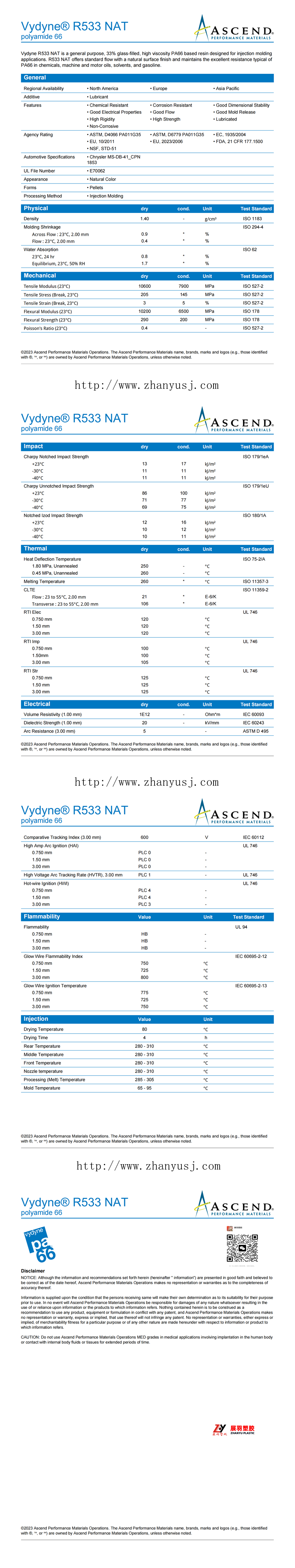 Vydyne® R533 NAT(PA66-GF33)Vydyne R533 NAT 是一種通用型、含33%玻璃纖維、高粘度的PA66基樹(shù)脂,適用于注塑成型應(yīng)用。