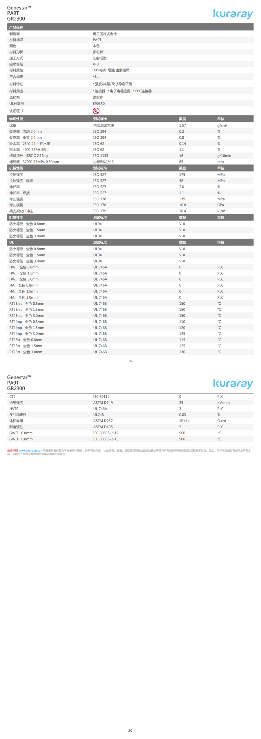 PA9T 可樂麗 Genestar GR2300 標(biāo)準(zhǔn) 鹵素阻燃V-0 玻璃含量30% 電子電器應(yīng)用