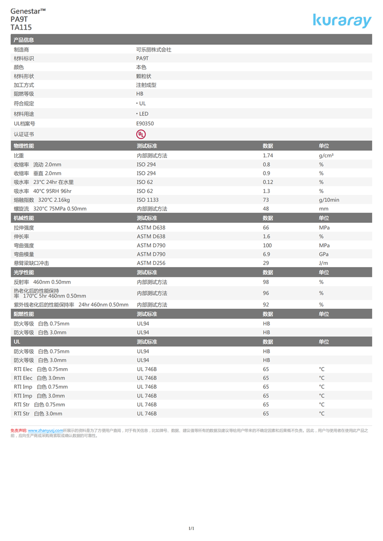 可樂麗 Genestar™ PA9T TA115 >PA9T< 阻燃等級(jí): HB 缺口沖擊: 2.95 kJ/m2 符合規(guī)定: UL 材料用途: LED