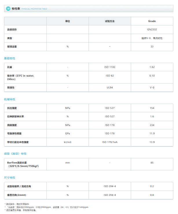 可樂(lè)麗 Genestar? PA9T GN2332 >PA9T-GF33-FR< 阻燃等級(jí): V-0 缺口沖擊: 13.9 kJ/m2 符合規(guī)定: UL 材料特性: 高流動(dòng)性