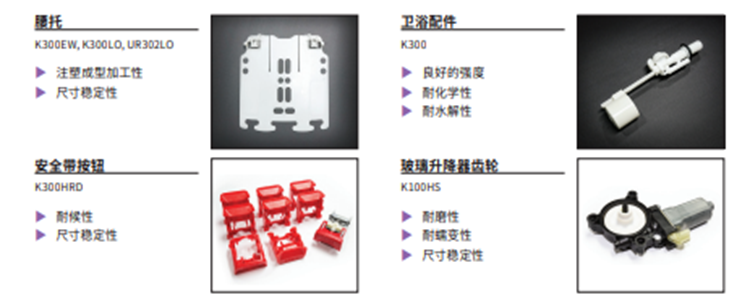 KOCETAL®是一種聚縮醛共聚物結晶度高的工程塑料。其代表性的特性是具有均衡的機械性能、低摩擦系數、優(yōu)秀的耐磨性、優(yōu)秀的耐燃料性的材料,吸濕率較低,具有穩(wěn)定的尺寸穩(wěn)定性。主要應用范圍不僅有齒輪、燃油泵模塊、門鎖、車窗調節(jié)器部件、安全帶部件的車載部件,還可使用于冰箱、空調、打印機等家用電器驅動部件,以及扣環(huán)、拉鏈等日常生活用品等領域,可廣泛應用。